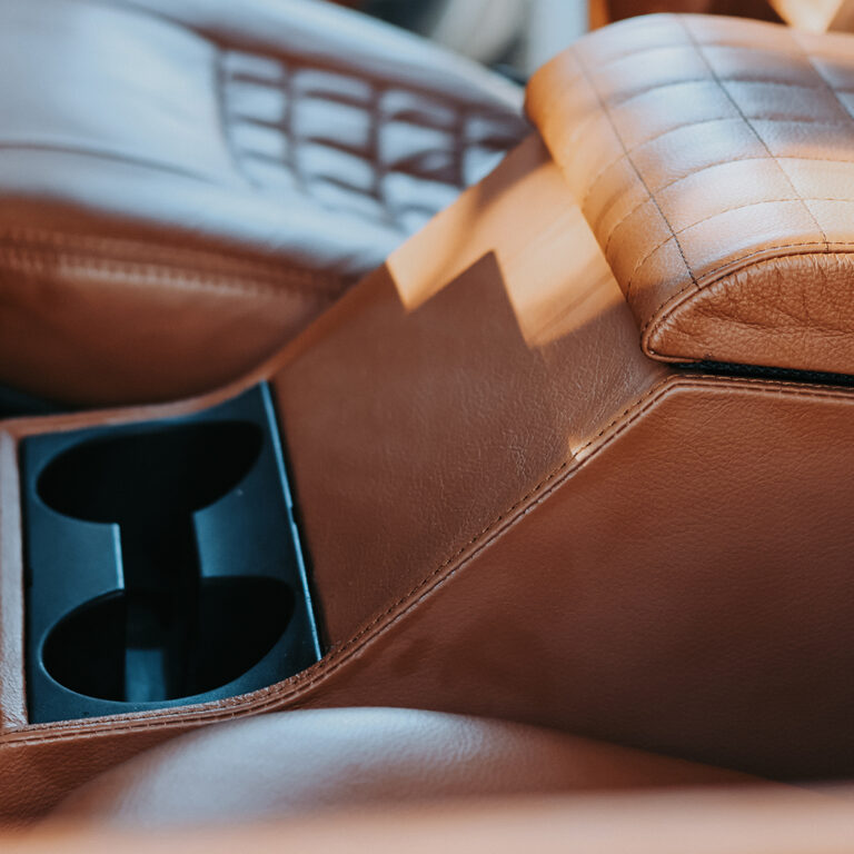 Inside, the Defender features front bucket seats and rear inward-facing jump seats, all upholstered in Saddle Tan leather. Modern comforts include air conditioning, a dash-mounted USB charging port, an analog clock, black rubber floor mats, and a padded center console with cup holders. The two-spoke steering wheel, wrapped in gray upholstery, frames a 200-km/h speedometer, a 7k-rpm tachometer, and gauges for coolant temperature and fuel level. For entertainment, this Defender 90 is equipped with a One Nav entertainment screen, complete with a reverse camera for added convenience and safety.
